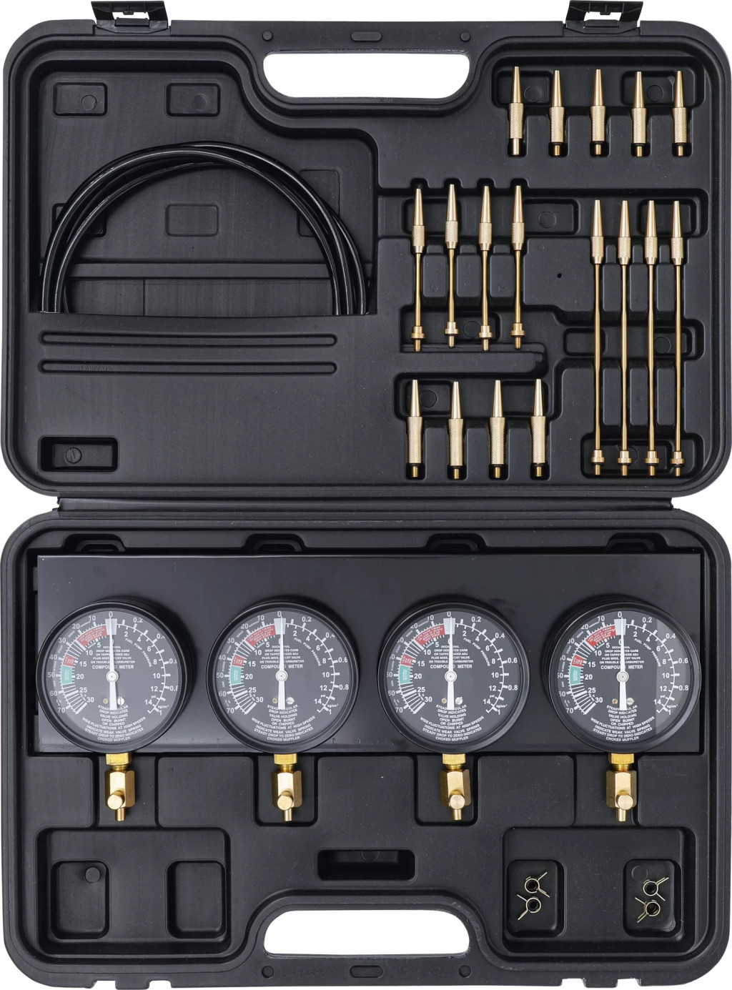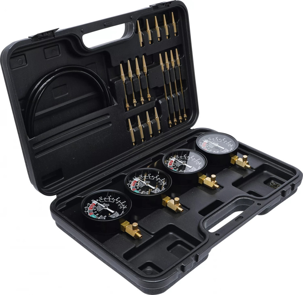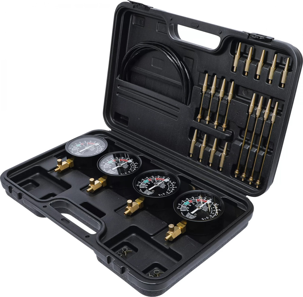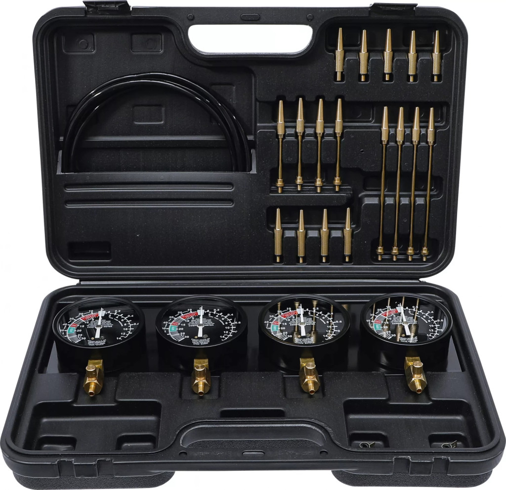 pentru sincronizarea instalatiilor cu 2, 3 si 4 carburatoareadecvat pentru vehicule si motocicletePachet de livrare:4 manometre Ø 92,5 mm, montate pe o placa4 furtunuri de cauciuc 8 x 5 x 750 mm4 coliere de furtun cu inele de etansare de schimb4 piese de legatura 53 mm (M6 x 0,75 mm)4 piese de legatura 60 mm (M6 x 1,00 mm)4 prelungitoare 3,9 x 102 mm4 prelungitoare 3,9 x 170 mmDomeniul de masurare depresiune: 0 pâna la -70 cm Hg (0 pâna la -30 In Hg)Domeniu de masurare presiuni: 0 pâna la 14 PSI (0 bis 1 kg/cm²)