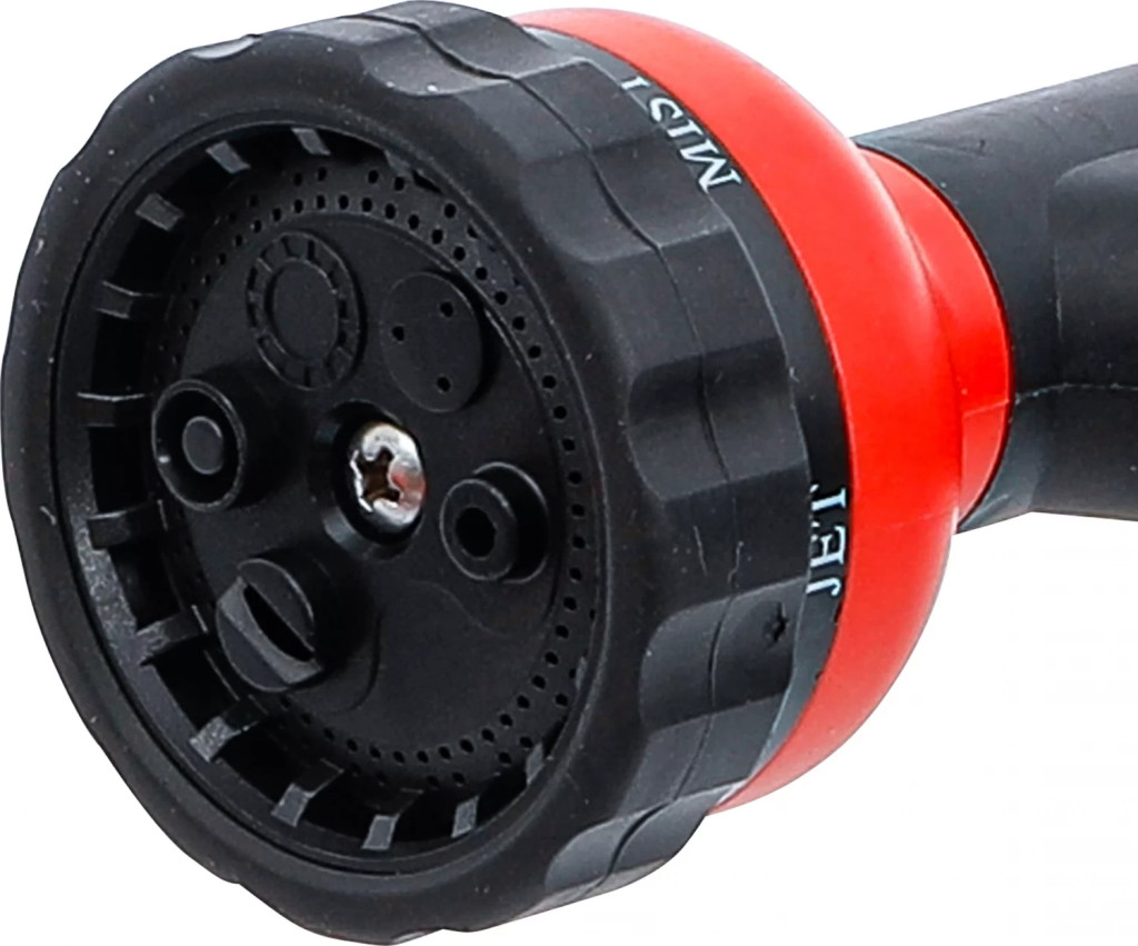 pentru irigarea suprafetelor cu gazon, plantelor, florilor, ciuberelor pentru plante, arborilor sau arbustilorde asemenea utilizabil pentru curatarea mobilei de gradina, a terasei sau la spalarea autovehiculelorsistemul simplu de cuplare faciliteaza o conectare si separare rapida si confortabila a furtunurilorMâner pistol ergonomic cu structura striata pentru o manevrare siguradatorita concavitatilor preformate de prindere, orice mâner sta bine prins, chiar si în mâini umedepermite reglarea jetului de apa la 6 profiluri de stropire diferite si cerintele individuale pentru fiecare domeniu de utilizareProfilul de stropire: ceata, jet pulverizat, jet conic, jet plat, dus, jet punctualClema de blocare pentru pârghia de operare permite utilizarea continuaConector rapid cu cuple rapide si piulite olandeze pentru o forta ridicata de prindere a furtunului si montare fara problemecompatibil cu toate sistemele de stropire prin ploaie uzualeMaterial stropitoare-dus de mâna: Material plastic (TPR + PP + ABS)Material adaptor racord conector robinet de apa: Material plastic ABSMaterial cuple rapide: Material plastic (PP)Culoare: rosu/negruPachet de livrare:1 Stropitoare-dus de mâna multifunctionala cu mâner-pistol si 6 functii separate1 Adaptor racord conector robinet de apa, filet interior 3/4", filet exterior 1/2"1 Conector robinet de apa cu cupla rapida, filet interior 1/2"1 Conector rapid cu cupla rapida 1/2"1 Conector rapid cu cupla rapida si opritor de apa 1/2"