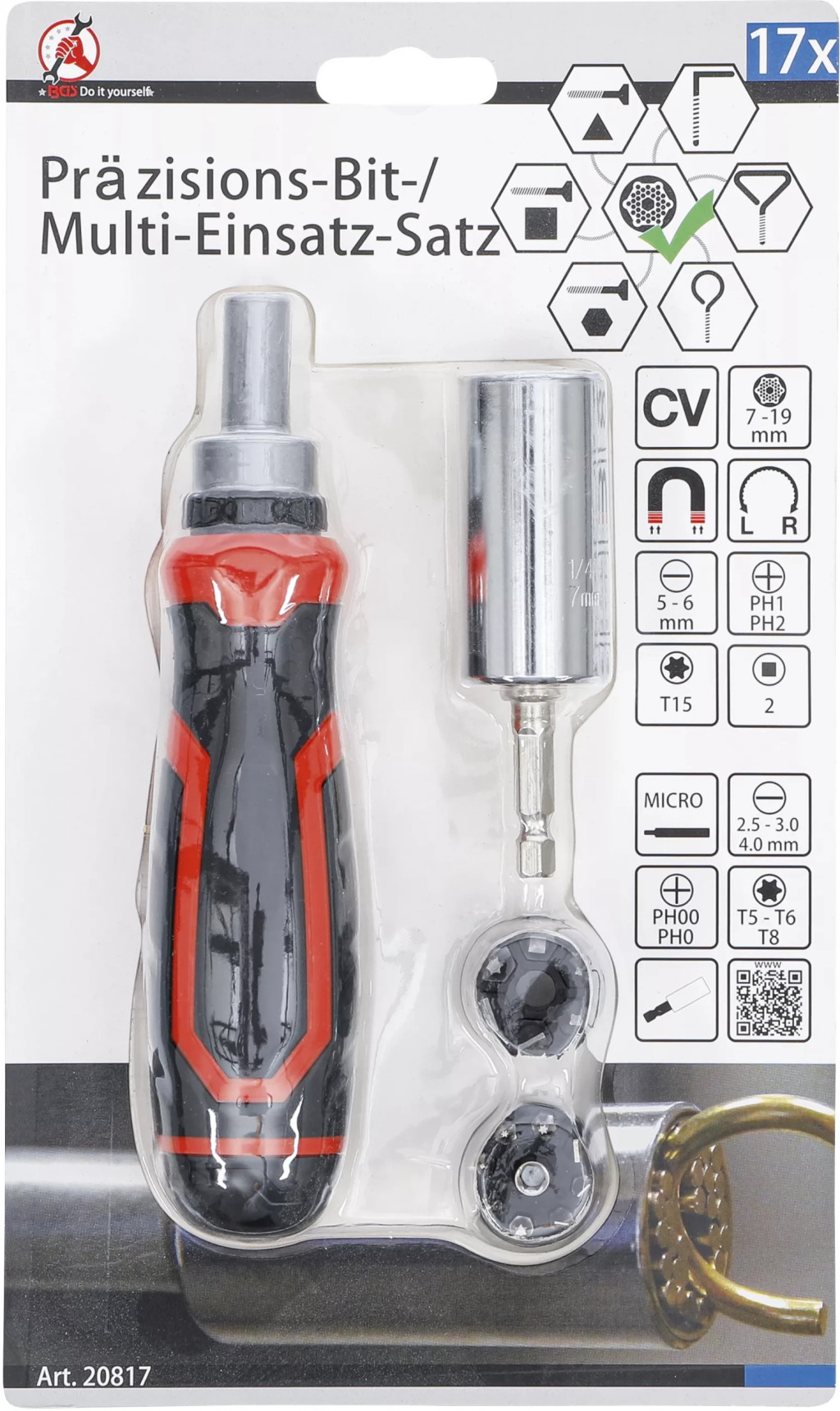20088208211 mâner surubelnita, magnetic, cu clip, cu magazie rotativa la capatul mânerului, Lungime: 110 mm1 Prelungitor, actionare hexagon interior, 4 mm, Lungime: 115 mm18 biti de precizie, actionare hexagont 4 mm, Lungime: 27 mm, în magazieBiti, lama dreapta 1,5 - 2 - 2,5 - 3 - 3,5 - 4 mmBiti, cap cruce PH 00 - 0 - 1 - 2Biti, hexagon interior 2 - 2,5 mmBiti, Profil T (pentru Torx) T5 - T6 - T7 - T8 - T9 - T101 carcasa magnetica 95 x 65 x 20 mm, Forta de tinere max: 400 g