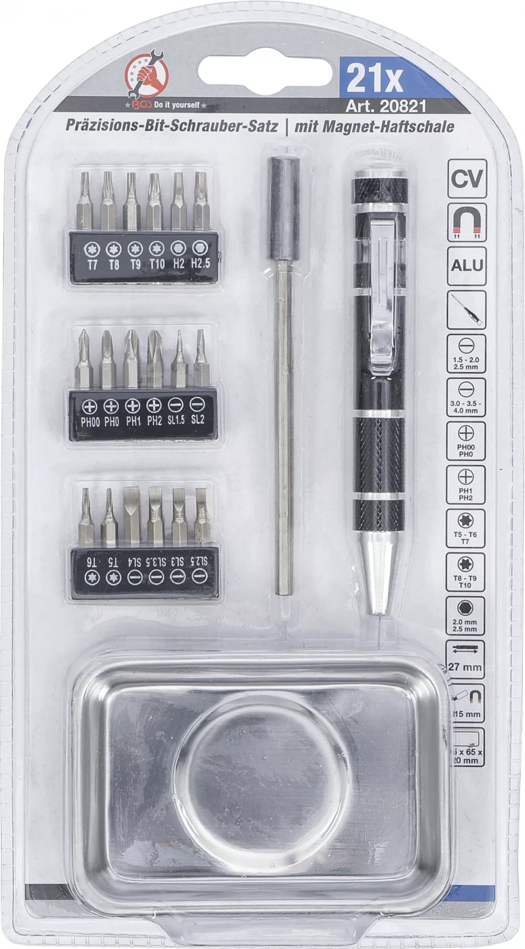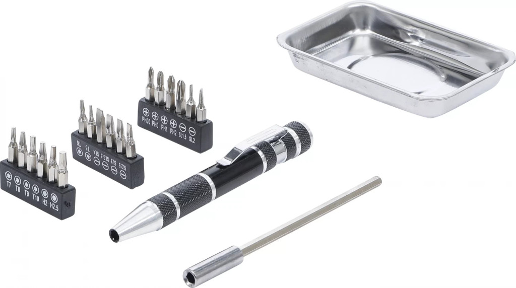 1 mâner surubelnita, magnetic, cu clip, cu magazie rotativa la capatul mânerului, Lungime: 110 mm1 Prelungitor, actionare hexagon interior, 4 mm, Lungime: 115 mm18 biti de precizie, actionare hexagont 4 mm, Lungime: 27 mm, în magazieBiti, lama dreapta 1,5 - 2 - 2,5 - 3 - 3,5 - 4 mmBiti, cap cruce PH 00 - 0 - 1 - 2Biti, hexagon interior 2 - 2,5 mmBiti, Profil T (pentru Torx) T5 - T6 - T7 - T8 - T9 - T101 carcasa magnetica 95 x 65 x 20 mm, Forta de tinere max: 400 g