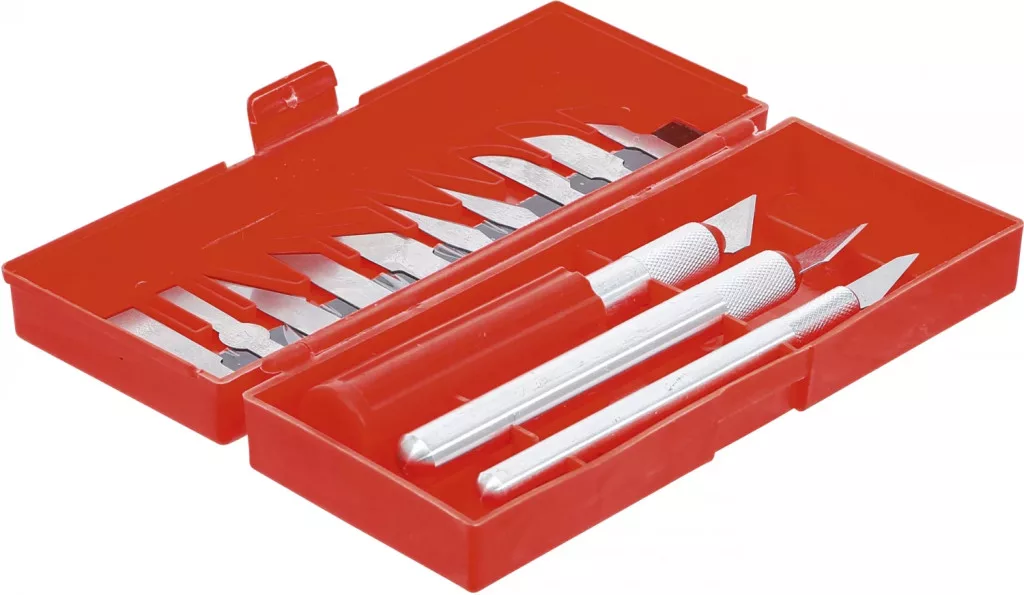 Utilizarea în constructia de mobila si designpentru taieturi precise de vinil, carton, hârtie etc.3 suporturi de cutit13 profiluri de lame cu tais drept, oblic, rotund în diferite marimiîn caseta din material plastic