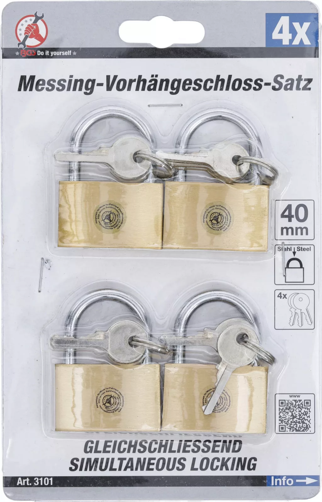 BGS DIY Set lacăte alamă | cheie identică| 40 mm | 4 piese (BGS 3101)