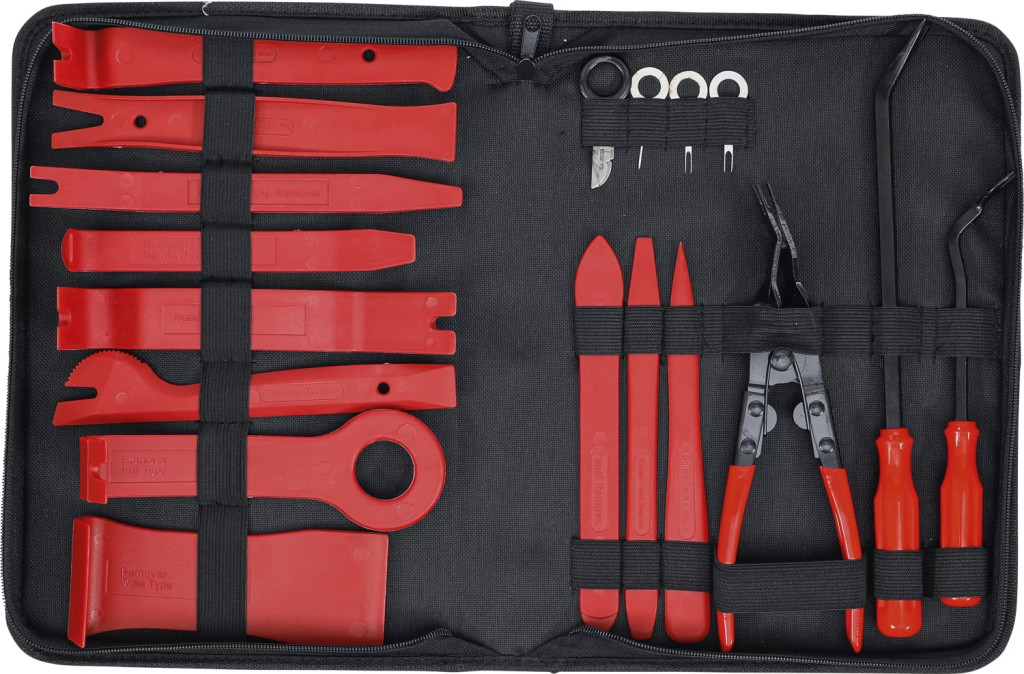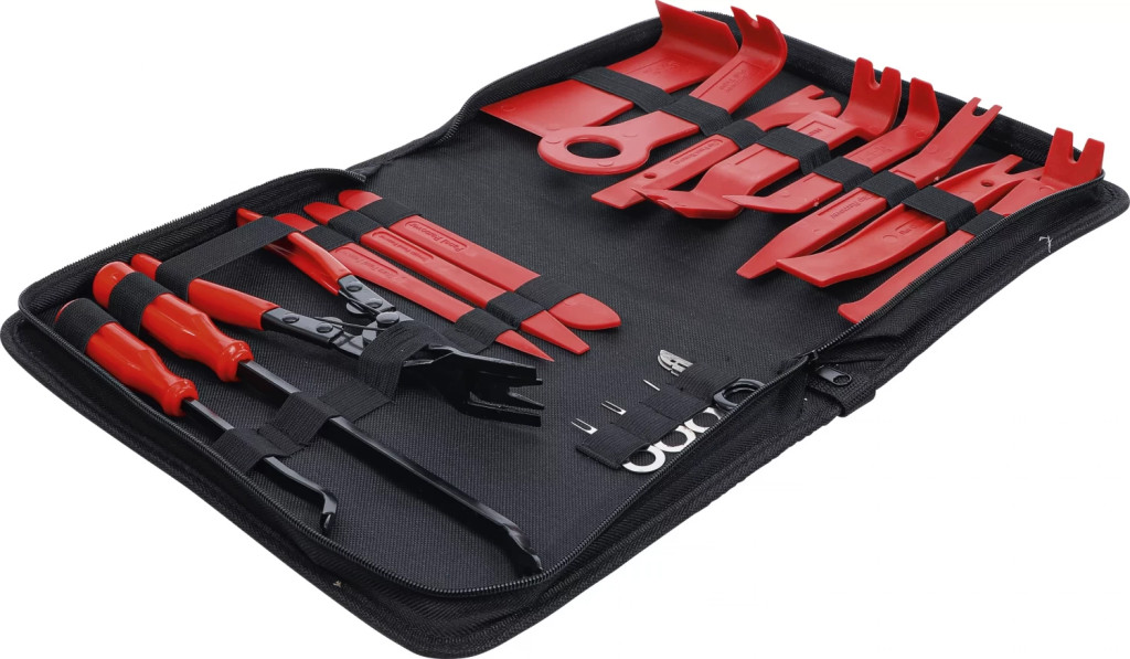 pentru demontarea fara deteriorare a pieselor de capitonaj, clemelor de plastic, acoperirilor, geamurilor oglinzilor retrovizoare etc.perfect utilizabil si în locuri greu accesibile si pe suprafetele lacuitedomeniu de utilizare larg datorita unei multitudini de scule de demontare diferitePachet de livrare:11 scule de demontare din material plastic întarit cu fibra de sticla în executie cu fanta, dreapta si în unghi, pentru demontarea baghetelor ornamentale, geamurilor oglinzilor, acoperirilor si capitonajelor în spatiul interior si la caroserieCleste de desprindere pentru capitonaj usa, lungime 245 mm, pentru desfacerea clemelor capitonajului usiiScula de desprindere a capitonajelor usilor, lungime 220 mm, în unghi de 45 grade, cu fanta de 6 mm, pentru demontarea de ex. a capitonajelor de usa si de la spatiul interiorScula de desprindere a capitonajelor usilor, lungime 310 mm, în unghi de 45 grade, cu fanta de 7 mm, pentru demontarea de ex. a capitonajelor de usa si de la spatiul interior2 cârlige extragere radio, pentru radiouri cu doua fante de deblocare 9x1 mm, adecvate de ex. pentru Becker, Blaupunkt, Alpine, Mercedes-Benz, Skoda, Audi, Ford si multe altele3 Scule de desprindere pentru contacte de racordare radio, pentru demontarea contactelor cu fise ISO si Mini-ISO si a contactelor blocate simplu în alte fise specifice pentru autoradioîn geanta cu fermoar