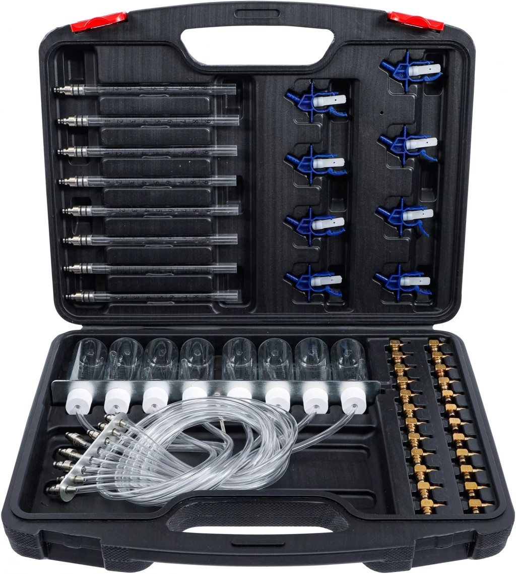Determinarea volumului de retur se realizeaza prin balonul de sticla sau prin recipientul de masurapentru motoare Common-Rail, pâna la 8 injectoarepotrivit pentru producatori de injectoare diversiPachet de livrare:8 baloane de sticla8 vase de masura cu furtun de racordare, montate pe rigla de aluminiu cu cârlige32 Adaptoare pentru:Denso C3, C1Siemens C3DelphiBosch