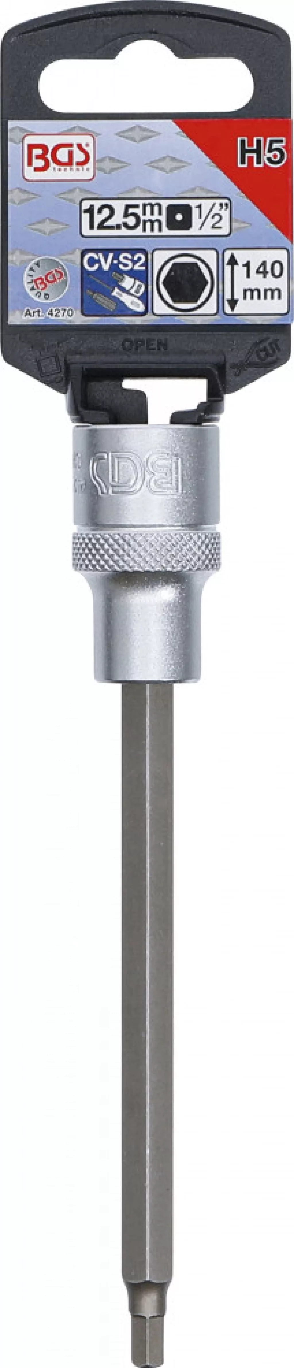 64794271Date tehnice Profil priza de putere Imbus hexagonal Lungime 140 mm Greutatea bruta 110 g Profil parte de actionare Patrat interior Marime profil parte de actionare, cota în toli 1/2 " Material Otel crom-vanadiu Îmbunatatire calitate suprafata Cromat, mat Marime profil priza de putere 6 mm Marime profil parte de actionare, metric 12,5 mm