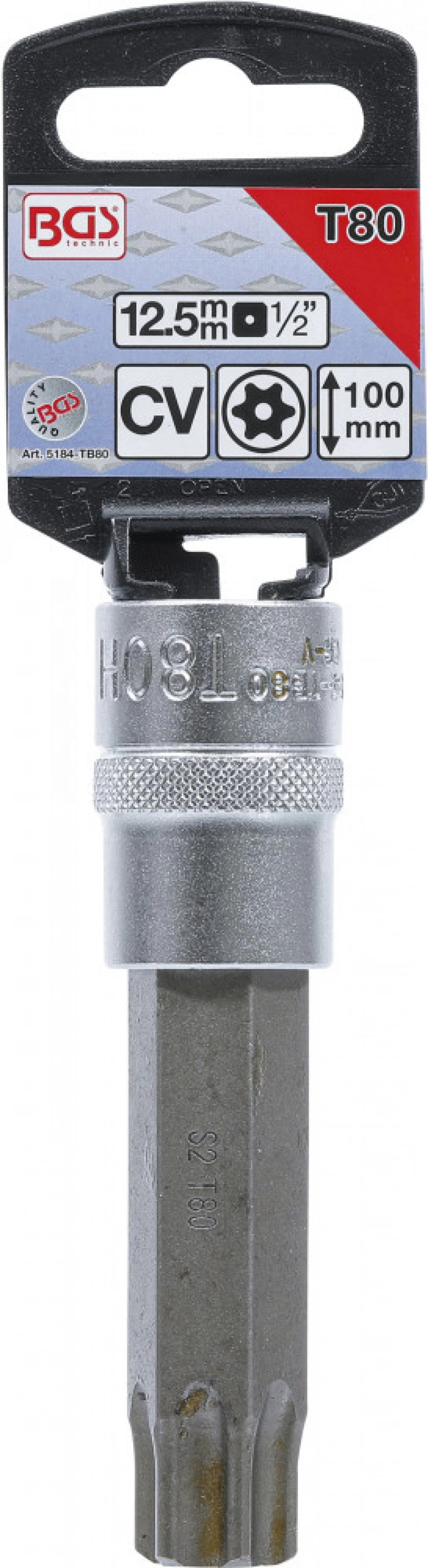 Date tehnice Profil parte de actionare Patrat interior Marime profil parte de actionare, cota în toli 1/2 " Marime profil parte de actionare, metric 12,5 mm Profil priza de putere Profil T (pentru Torx) cu orificiu Marime profil priza de putere T80 Îmbunatatire calitate suprafata Cromat, mat Material Otel crom-vanadiu Lungime 100 mm Greutatea bruta 230 g