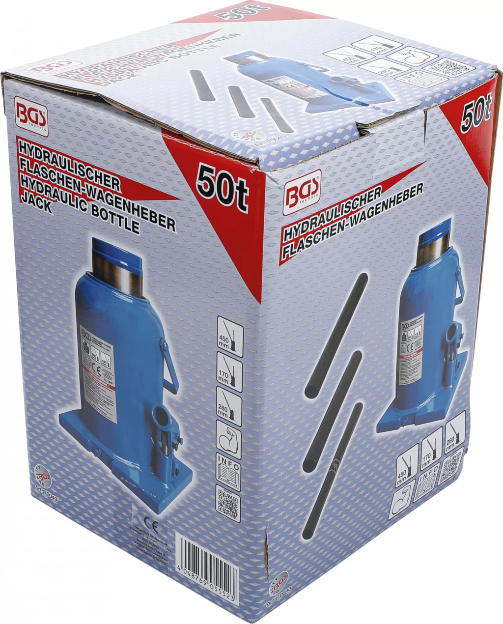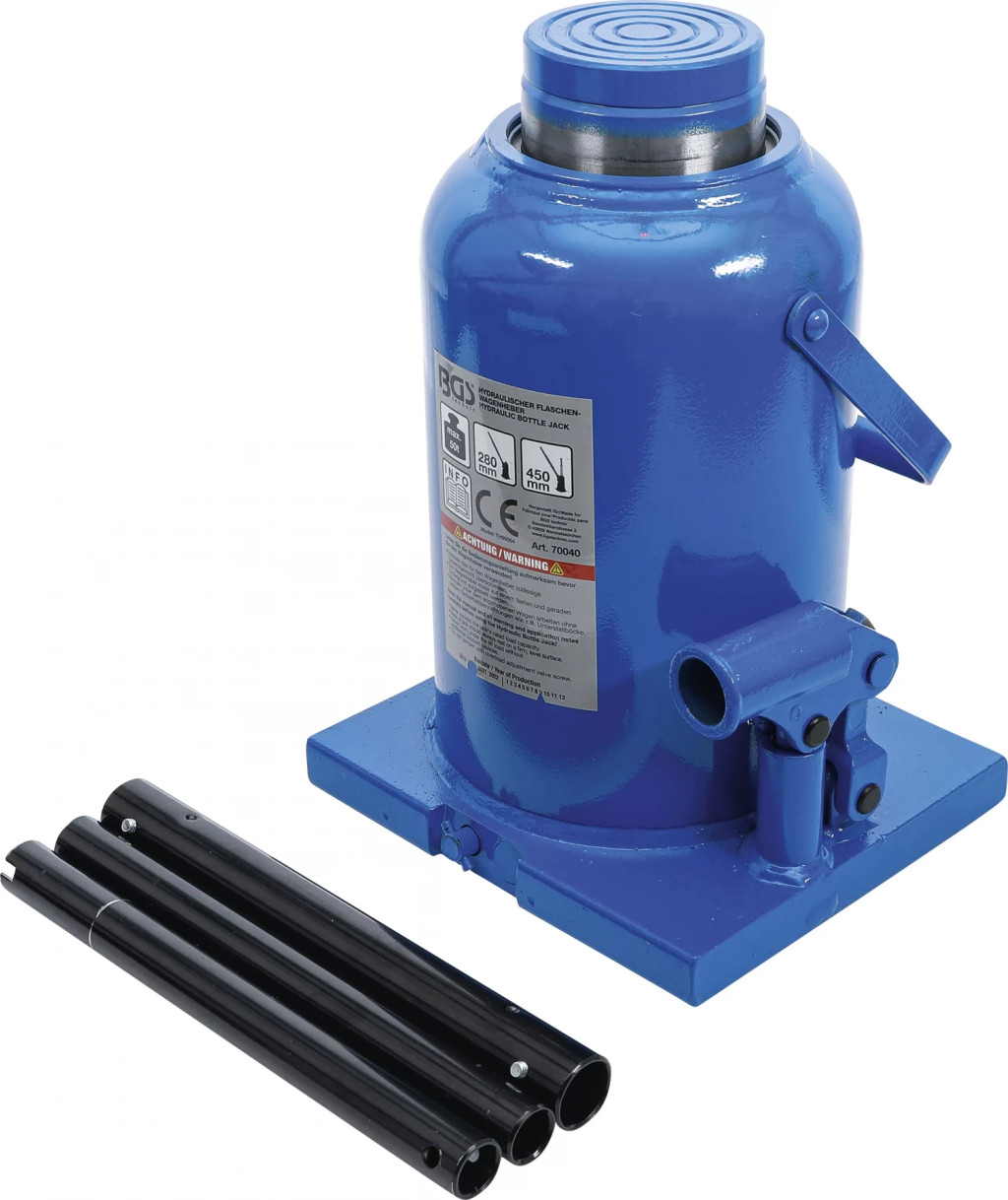 Cricul hidraulic tip butelie BGS technic 70040 este un echipament heavy-duty cu capacitate maximă de ridicare 50 tone, proiectat pentru camioane, utilaje și aplicații industriale extreme. Dispune de piston telescopic inclus, supapă de siguranță împotriva suprasarcinii și bază extra-largă pentru stabilitate maximă, fiind potrivit pentru utilizare profesională intensivă chiar și în spații restrânse