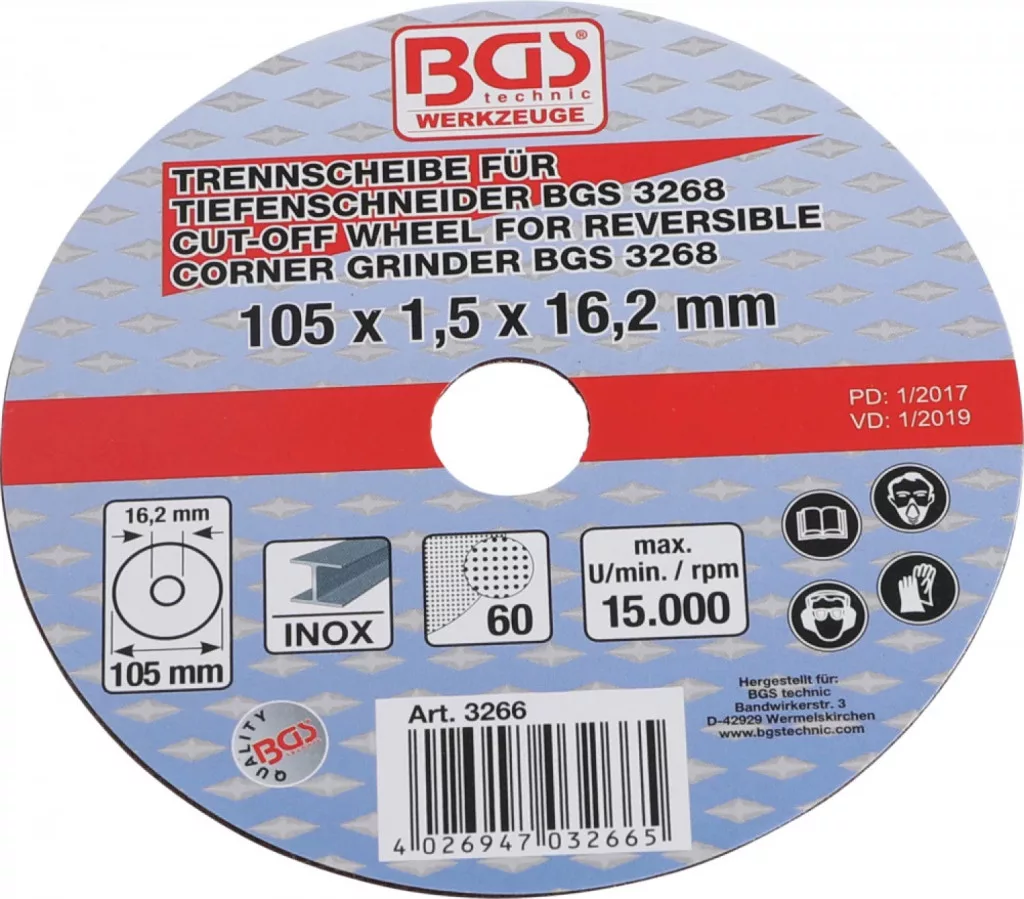 BGS technic Disc abraziv pentru taiere metal, 105x1.5x16.2 (BGS 3266)