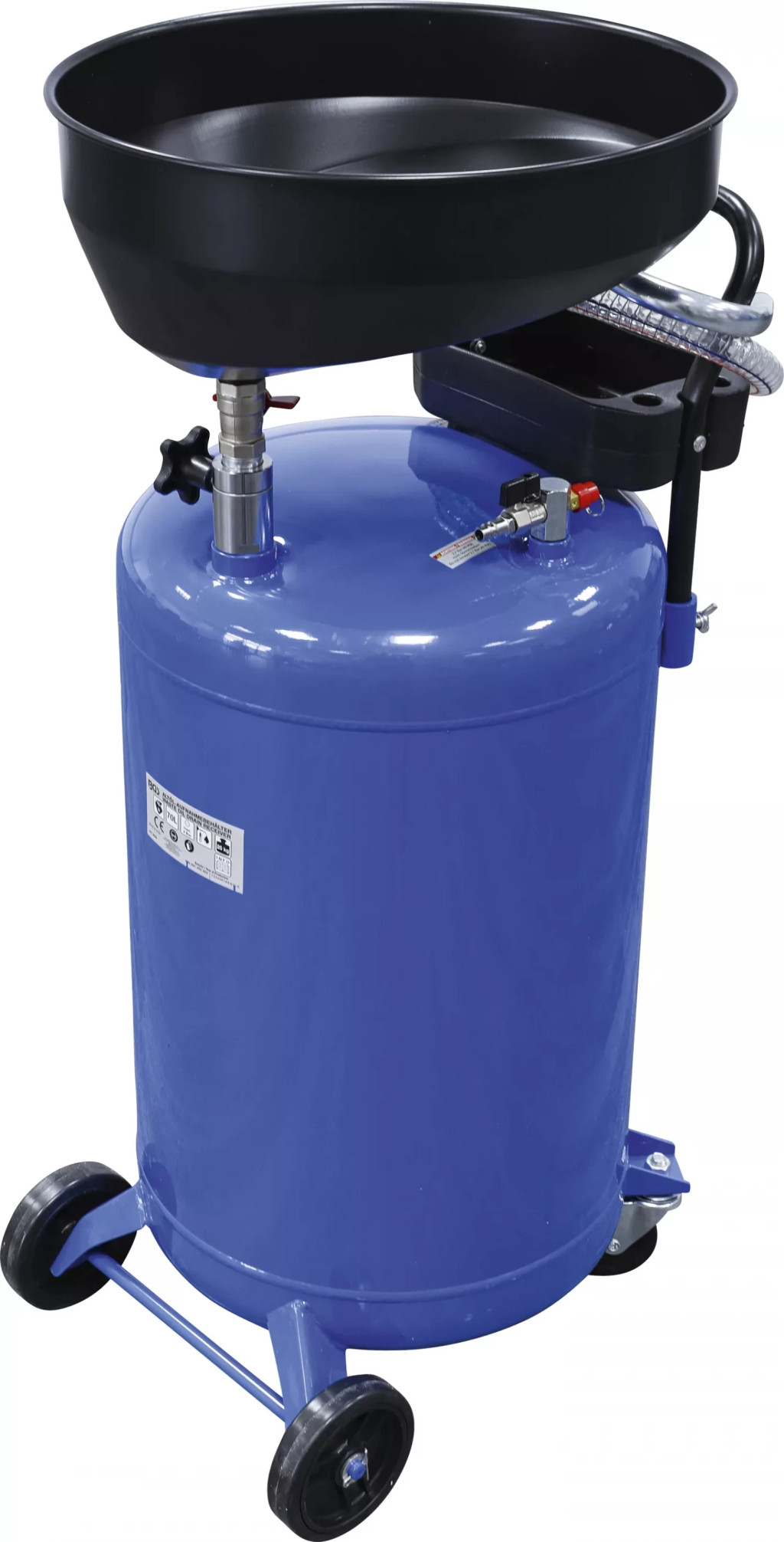foloseste pentru colectarea uleiurilor de motor, de transmisie, de diferential sau a agentilor de tip antigelgolire pneumatica sub presiune cu supapa de sigurantarobinet de blocare si surub clema pentru golirea subpresiunerecipient deplasabil si dirijabil cu roti extra mari din material plasticcu mâner de transportcuva de colectarea montate central si reglabila pe înaltimeindicator transparent nivel de umplere cu scala de masurarefurtun cu tesatura transparenta pentru golirea recipientuluiDiametru recipient: 380 mmPresiune deschidere (supapa de siguranta): cca. 0,6 bar (8 psi)Diametru pâlnie de colectare: max. 420 mmDiametru teava de evacuare: 25 mmLungime teava de evacuare: 720 mmÎnaltime totala min.: 100 cmÎnaltime totala max.: 160 cm