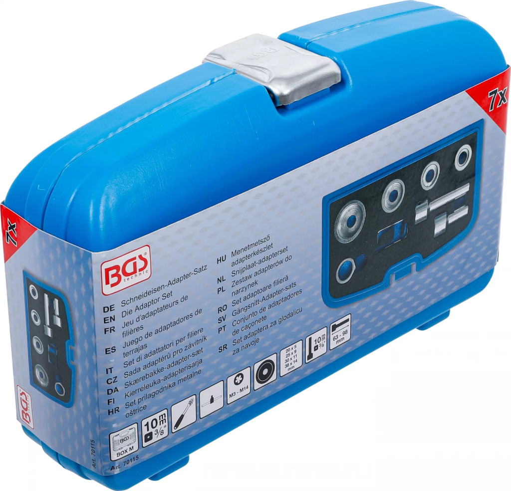 da posibilitatea taierii ulterioare a filetelor exterioare a prezoanelor etc.adecvat pentru toate marimile de filiera de M3 - M14utilizabil cu clichet reversibil, astfel utilizabil si în locuri greu accesibileincl. stift filetat pentru fixarea filierei în adaptorPachet de livrare:1 Portfiliera 20 x 5 mm1 Portfiliera 25 x 9 mm1 Portfiliera 30 x 11 mm1 Portfiliera 38 x 14 mm1 Adaptor hexagonal pentru portfiliera1 adaptor patrat pentru portfiliera, actionare 10 mm (3/8"), lungime 63 mm1 adaptor patrat pentru portfiliera, actionare 10 mm (3/8"), lungime 98 mm