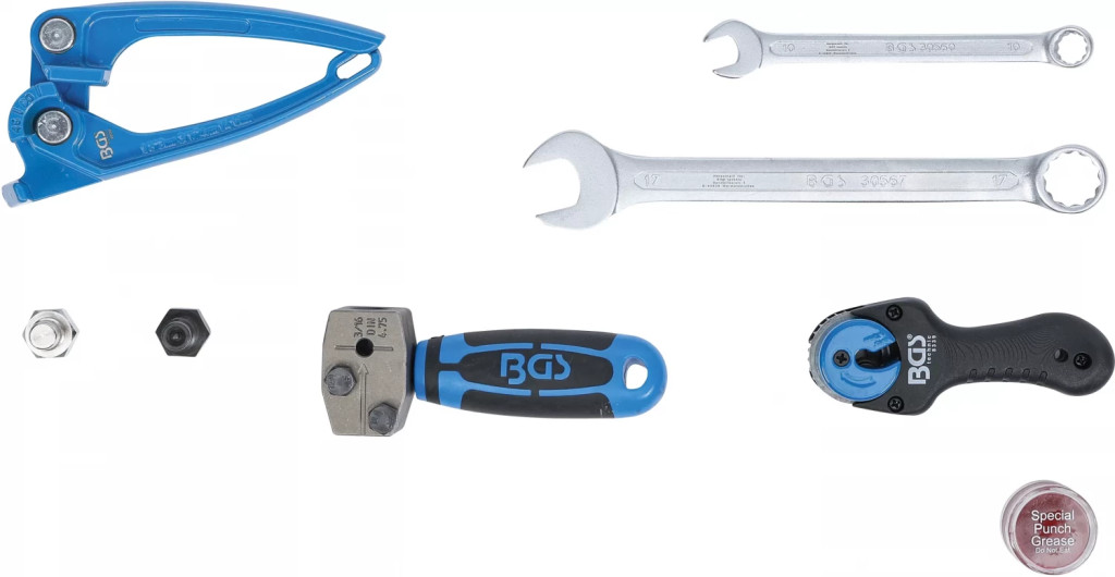 utilizabil si la conductele de frâna montateadecvat pentru conducte de frâna din cupru, aluminiu si otelAparat de bordurare conducte de frâna 4,75 mm (3/16") conform tip DIN FCleste taiere conducte frâna cu clichet pentru taierea conductelor de frâna de 4,75 mm (3/16"), rotirea completa a ansamblului sculei în jurul conductei de frânaCleste de îndoire tevi pentru îndoirea conductelor de diametru 3 mm, 4,75 mm si 6 mmPachet de livrare:Aparat de bordurare cu mâner din 2-componenteŞurub opritorŞurub de bordurareVaselina de bordurareTaietor conducte frâna cu clichet (BGS 8339)Cleste îndoire tevi. (BGS 8228)Cheie combinata, 10 mm (BGS 30560)Cheie combinata, 17 mm (BGS 30567)