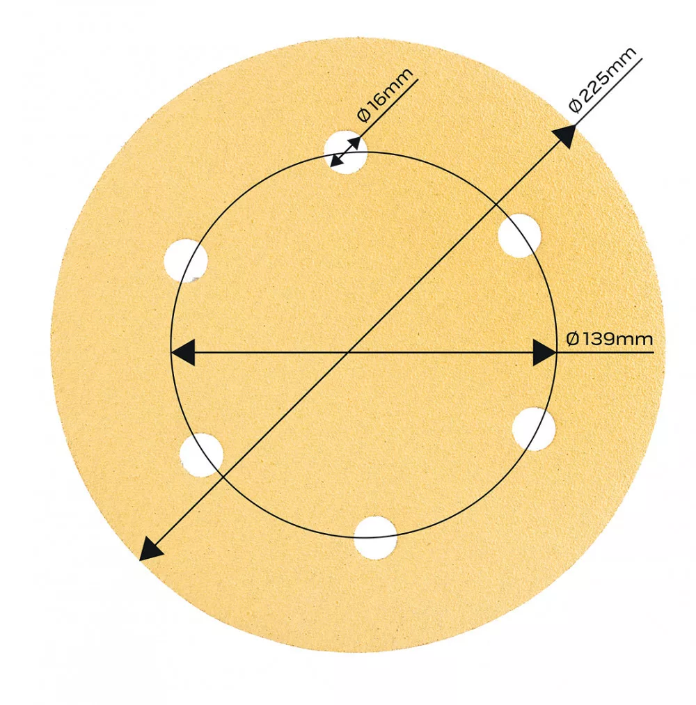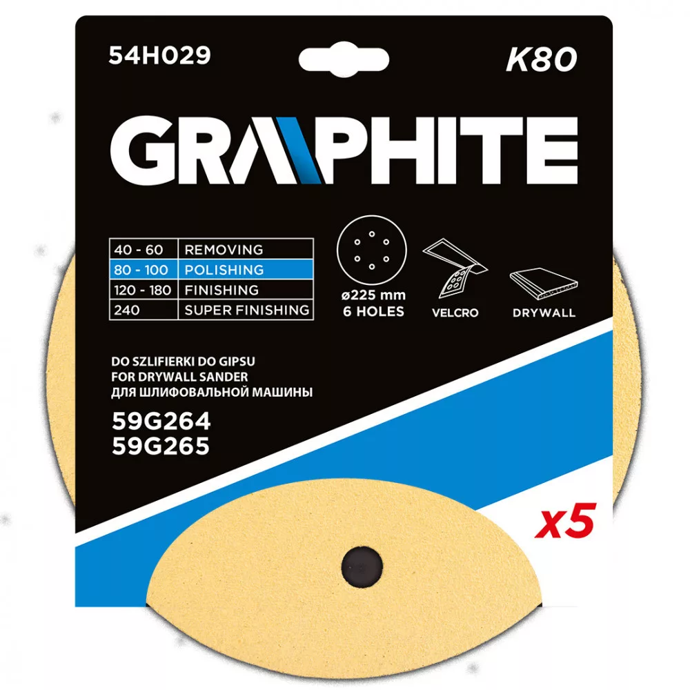 GRAPHITE Hârtie de Șlefuit cu Velcro, 225mm, K80, 5 bucăți, 6 găuri, pentru șlefuitor 59G264, 59G265 (54H029)