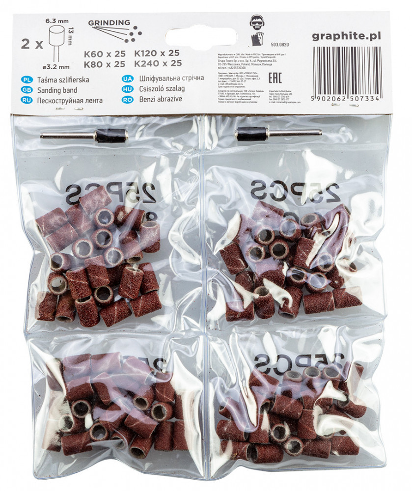 GRAPHITE Manșon de polizat, 6.3mm, K60, K80, K120, K240, set 100buc + ax 3.2mm, 2buc (55H076)