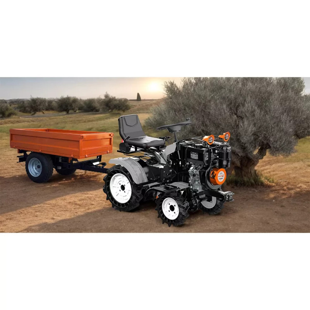 Roțile agricole mari oferă stabilitate și tracțiune superioară, iar frezele rezistente asigură o mărunțire eficientă a solului. Farul frontal permite utilizarea echipamentului și în condiții de vizibilitate redusă.