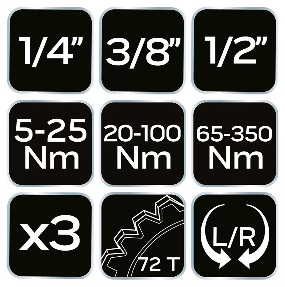 NEO Set de chei dinamometrice "double-click", 3 bucăți: 1/4", 3/8", 1/2" (08-845)