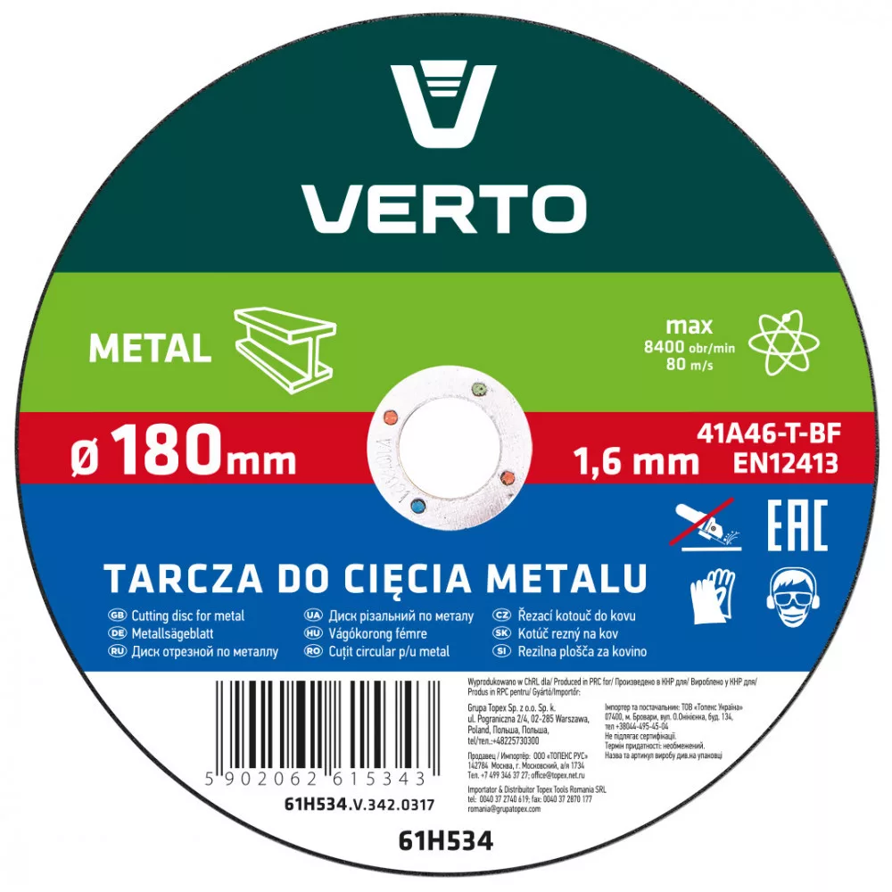 VERTO DISC DE TĂIERE PENTRU METAL 180x1.6x22MM T40 (61H534)