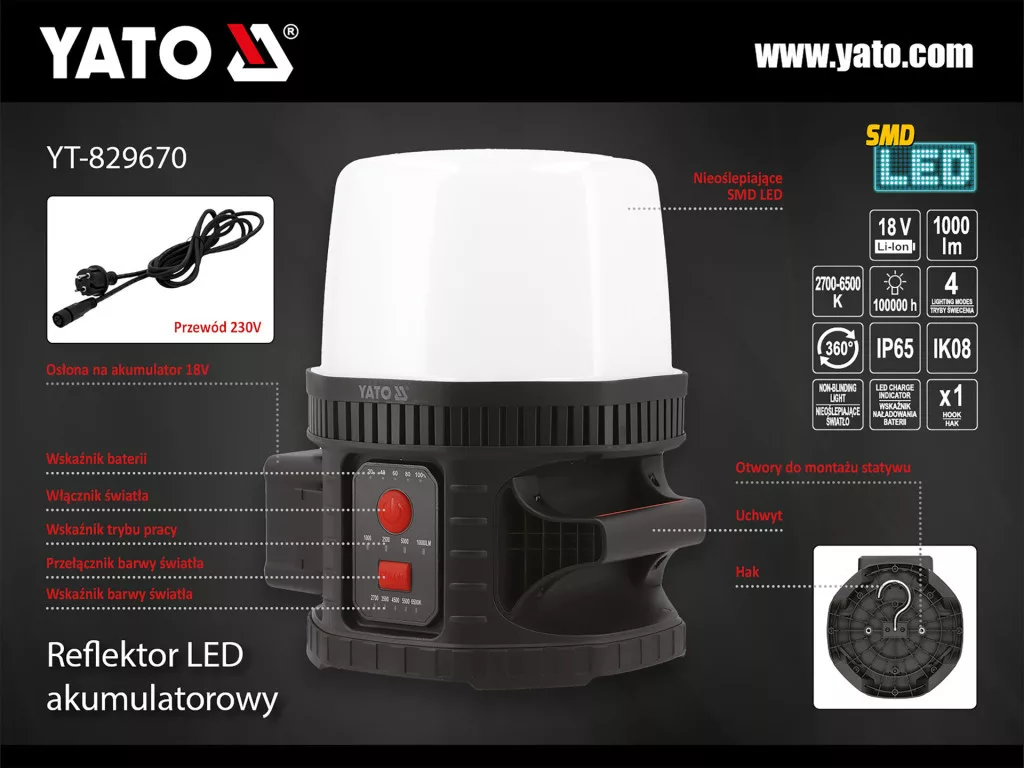 YATO Proiector LED cu acumulator 18V 10000 LM 360° (YT-829670)