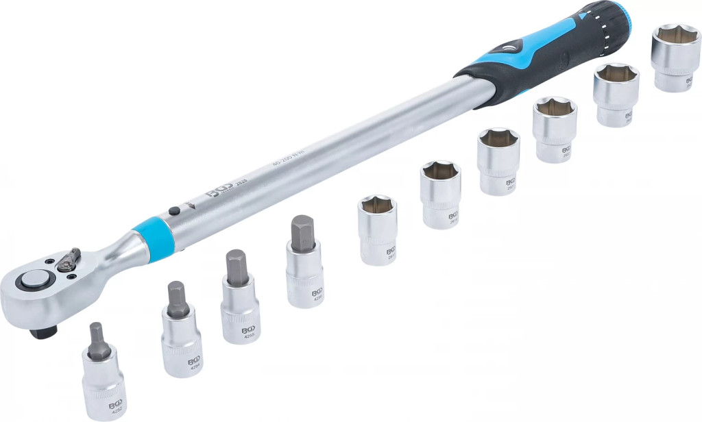 ansamblu set universalpotrivit pentru strângerea la moment de rotatie setat a însurubarilor cu filet pe dreaptaclichet reversibil integrat cu forma îngusta a capuluimecanism cu clichet, comutabilblocare si deblocare simpla la mânermâner din material plastic configurat optim pentru reglarea usoara a valorii momentului de rotatie dorit, precum si o tinere sigura a sculeisemnal de declansare audibil clarvizorul mare cu functie lupa optimizeaza precizia citiriiScala de finete: 0,5 NmDeclansare pe dreapta: daDeclansare pe stânga: nuPachet de livrare:1 cheie dinamometrica | antrenare patrat exterior 12,5 mm (1/2") | 40 - 200 Nm1 cap cheie tubulara hexagon | Actionare patrat interior 12,5 mm (1/2") | 17 mm (BGS 2917)1 cap cheie tubulara hexagon | Actionare patrat interior 12,5 mm (1/2") | 19 mm (BGS 2919)1 cap cheie tubulara hexagon | Actionare patrat interior 12,5 mm (1/2") | 21 mm (BGS 2921)1 cap cheie tubulara hexagon | Actionare patrat interior 12,5 mm (1/2") | 22 mm (BGS 2922)1 cap cheie tubulara hexagon | Actionare patrat interior 12,5 mm (1/2") | 24 mm (BGS 2924)1 cap cheie tubulara hexagon | Actionare patrat interior 12,5 mm (1/2") | 27 mm (BGS 2927)1 cap bit | Actionare patrat interior 12,5 mm (1/2") | hexagon interior 6 mm (BGS 4252)1 cap bit | Actionare patrat interior 12,5 mm (1/2") | hexagon interior 8 mm (BGS 4254)1 cap bit | Actionare patrat interior 12,5 mm (1/2") | hexagon interior 10 mm (BGS 4255)1 cap bit | Actionare patrat interior 12,5 mm (1/2") | hexagon interior 12 mm (BGS 4256)