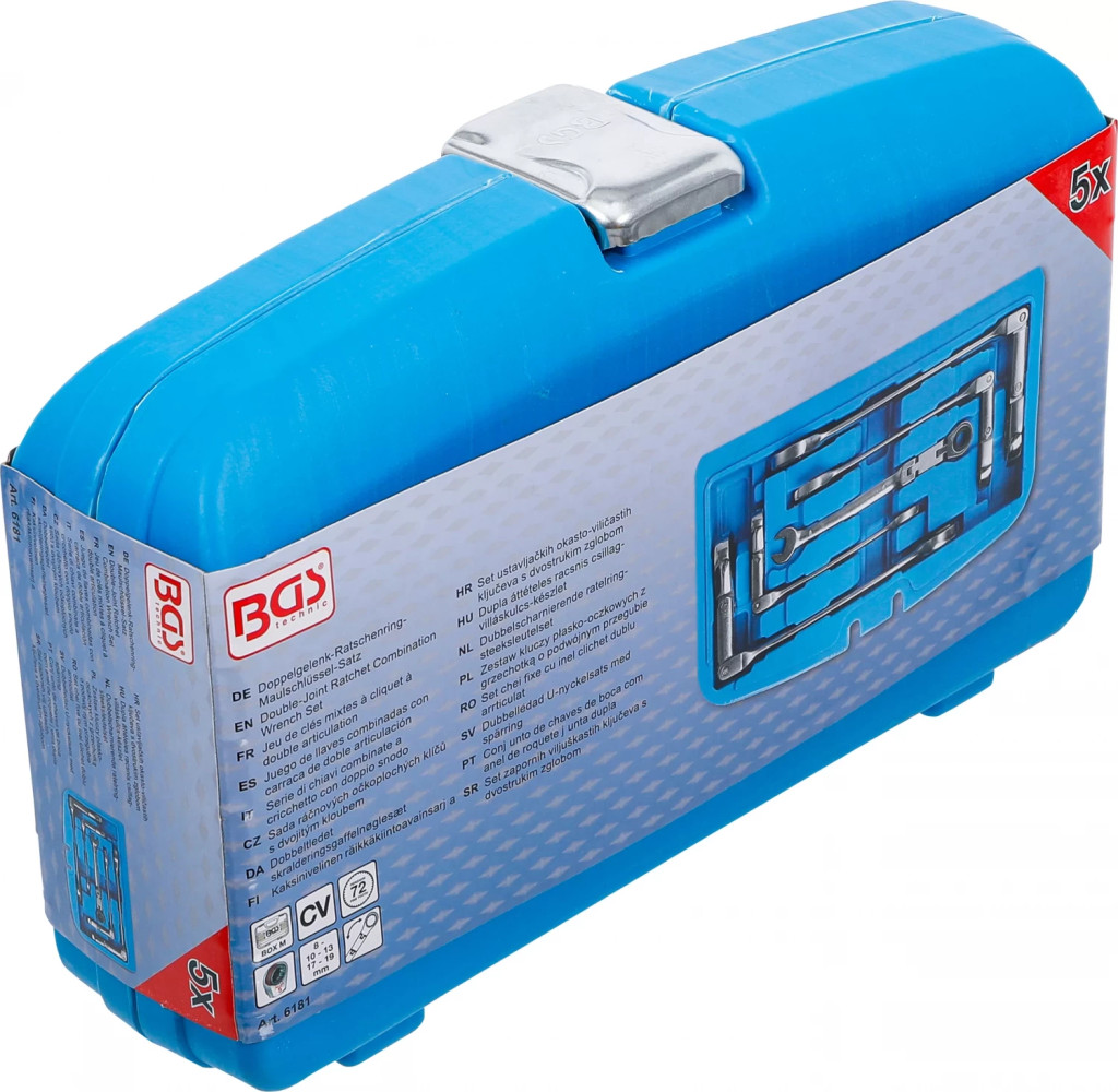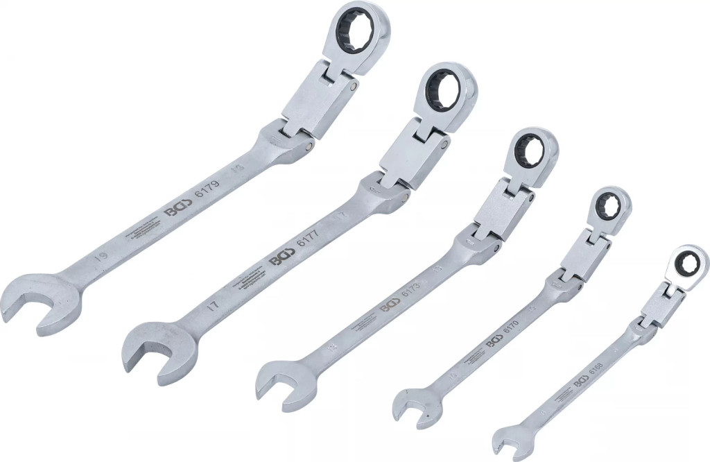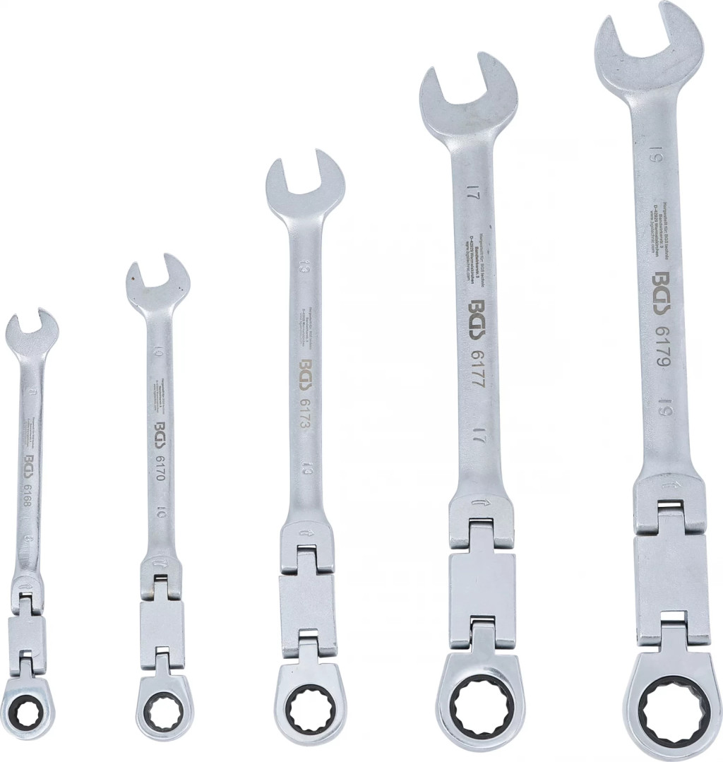 pentru zone de lucru greu accesibile în spatii înguste si îmbinari însurubate adânc amplasateforma constructiva îngustaCap cheie inelara cu clichet cu articulatie dublaCap cheie inelara cu clichet, rabatabil cu 180° fara treptecu dantura fina 72 dintiVarianta de executie metricaUnghi de actionare: 5°Pachet de livrare:1 Cheie combinata cu inel clichet dublu articulat | articulata | 8 mm, lungime 162 mm (BGS 6168)1 Cheie combinata cu inel clichet dublu articulat | articulata | 10 mm, lungime 179 mm (BGS 6170)1 Cheie combinata cu inel clichet dublu articulat | articulata | 13 mm, lungime 223 mm (BGS 6173)1 Cheie combinata cu inel clichet dublu articulat | articulata | 17 mm, lungime 261,5 mm (BGS 6177)1 Cheie combinata cu inel clichet dublu articulat | articulata | 19 mm, lungime 284 mm (BGS 6179)