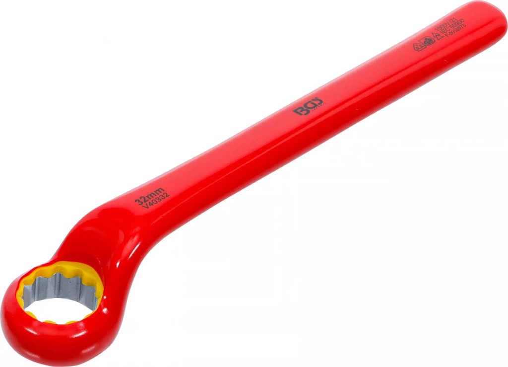 Cheie inelara la un capat, cotita adâncpentru lucrul în siguranta în zona pieselor sub tensiunereduce pericolul de scurt circuitscula optima pentru electricieni si personalul electrotehnicpentru instalarea bornelor si mufelor, racordurilor conductorilor, însurubarea sinelor de curentforjata în matritaVDE izolat pâna la 1000 V, conform EN 60900/IEC 60900Profil antrenare: douasprezece colturiDIN: EN/IEC 60900Material: otel crom-vanadiuDeschidere cheie: 32 mm